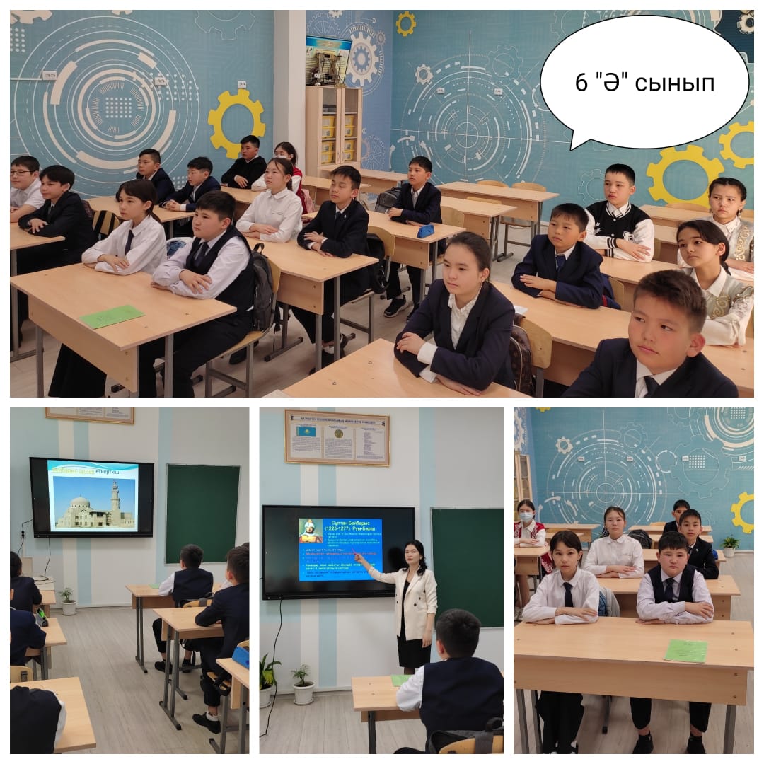 Бейбарыс сұлтанның 800 жылдық мерейтойына орай 28.03.2023ж.күні "Бейбарыс сұлтанның ерлігі" тақырыбында 5-11сынып оқушыларымен сынып сағаттары өткізілді, сабақ барысында қыпшақ даласынан шыққан Мысыр еліндегі Мәмлүктер мемлекетнің билеушісі Сұлтан Бейбарыстың өмірі туралы қызықты мәліметтер айтылып, сол кезеңдегі Алтын Орда ханы Берке хан арасындағы дипломатиялық қарым-қатынастары туралы айтылды. Сабақтың мақсаты: Қазақ даласынан шыққан әлемге танымал тұлға Бейбарыс сұлтанның қызметі туралы баяндап, білім алушылардың бойында елжандылық, отансүйгіштік қасиеттерін арттыру