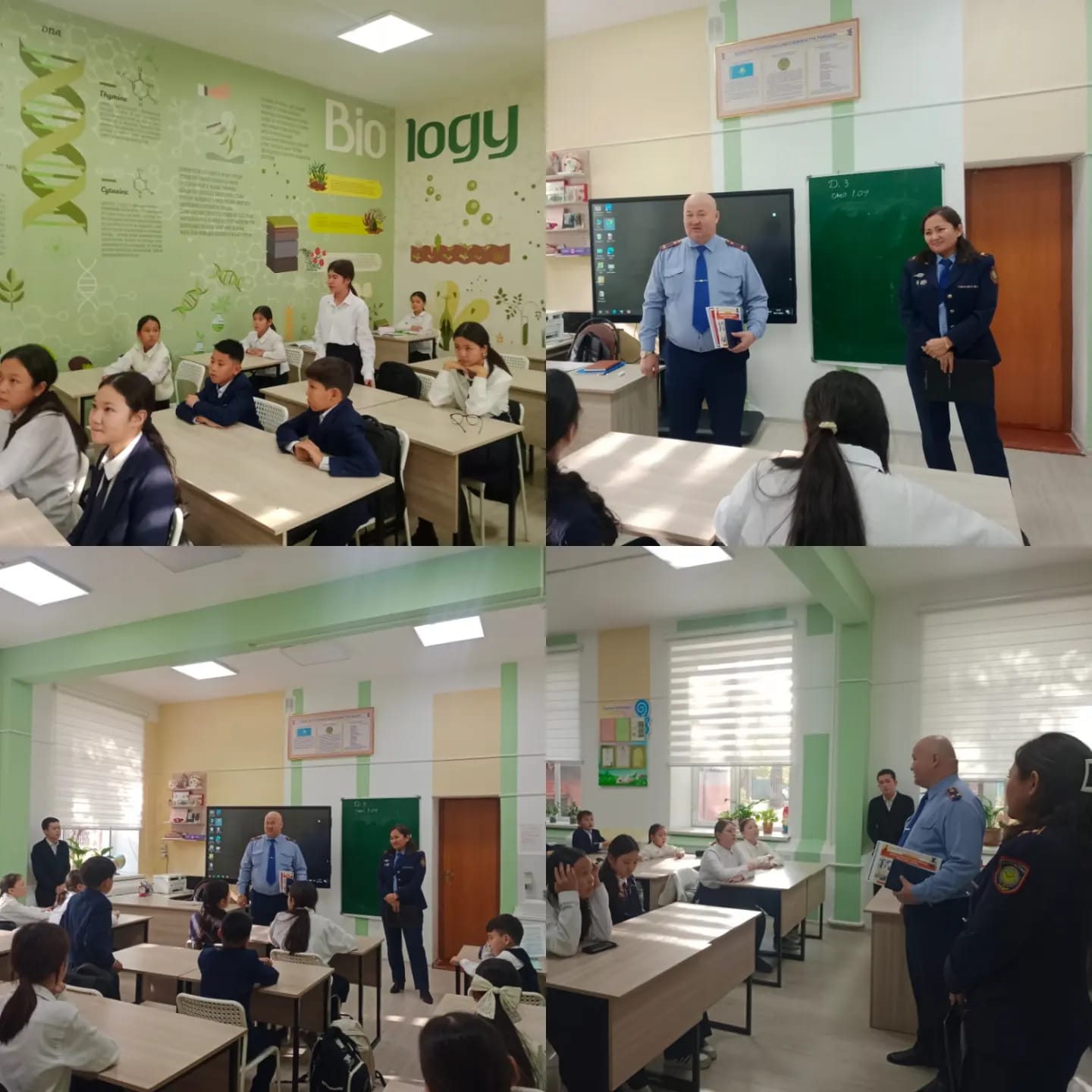 2023 жылдың 6 қараша күні Алматы 2 Желілік полиция бөлімшесінің бастығы полиция подполковнигі Аитов Айдын Зейнелханович пен полиция подполковнигі Жалдыбаева Ләзат Абдильманатовна директордың тәрбие ісі жөніндегі орынбасары Р.А.Кумбаеваның қатысуымен, №43 ЖББ мектептің 5-7 - сынып оқушыларына «Тоқтаңыз, басып кету қаупі бар!» тақырыбында әңгіме-дәріс жүргізді.