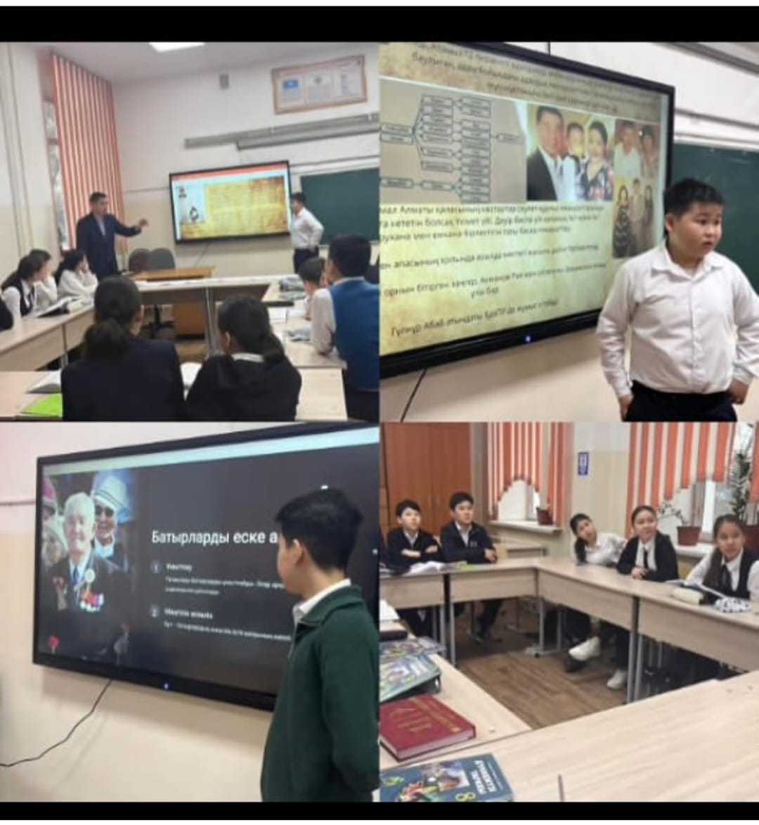 12 наурыз 2025 0 1 2 3 4 5 "Менің атам тарих беттерінде" 7ә сынып оқушылары Ысқақбек Заманғали және Байтұрсынов Темірлан соғысқа қатысқан аталары туралы презентация жасап, зерттеу жұмыстарын көрсетті.