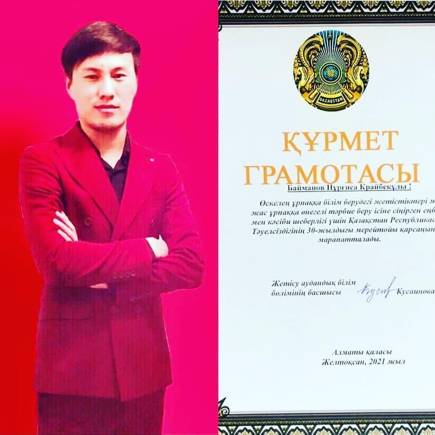 Қазақстан Республикасы Тәуелсіздігінің 30 жылдық мерекесіна орай өскелең ұрпаққа білім берудегі жетістіктері және жас ұрпаққа өнегелі тәрбие беру ісіне сіңірген еңбегі мен кәсіби шеберлігі үшін №43 жалпы білім беретін мектебінің музыка пәні мұғалімі Байманов Нұрғиса Крайбекұлы Жетіс ауданының білім бөлім басшысы С.Кусаинованың құрмет грамотасымны марапатталды