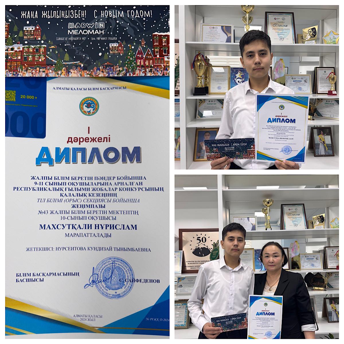 Республикалық ғылыми жобалар конкурсының қалалық кезенінің тіл білімі секциясы бойынша N43 ЖББ мектептің 10 сынып оқушысы Махсутқали Нұрислам 1 дәрежелі дипломмен және Меломанның ақшалай сертификатына ие болды. Жетекшісі: орыс тілі мен әдебиеті пәні мұғалімі Нурсеитова Кундызай Тынымбаевна
