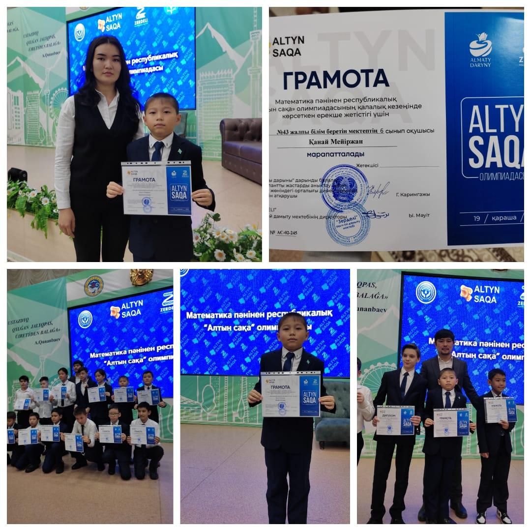 01 желтоқсан 2022 0 1 2 3 4 5 "Алтын сақа" 01.12.2022 жылы 5-6 сынып оқушылары арасында өткен математика пәнінен республикалық "Алтын сақа" олимпиадасының қалалық кезеңінде көрсеткен ерекше жетістігі үшін мектебіміздің 6 "Ә" сынып оқушысы Қанат Мейіржан марапатталды. Жетекшісі: Канназарова Тілектес