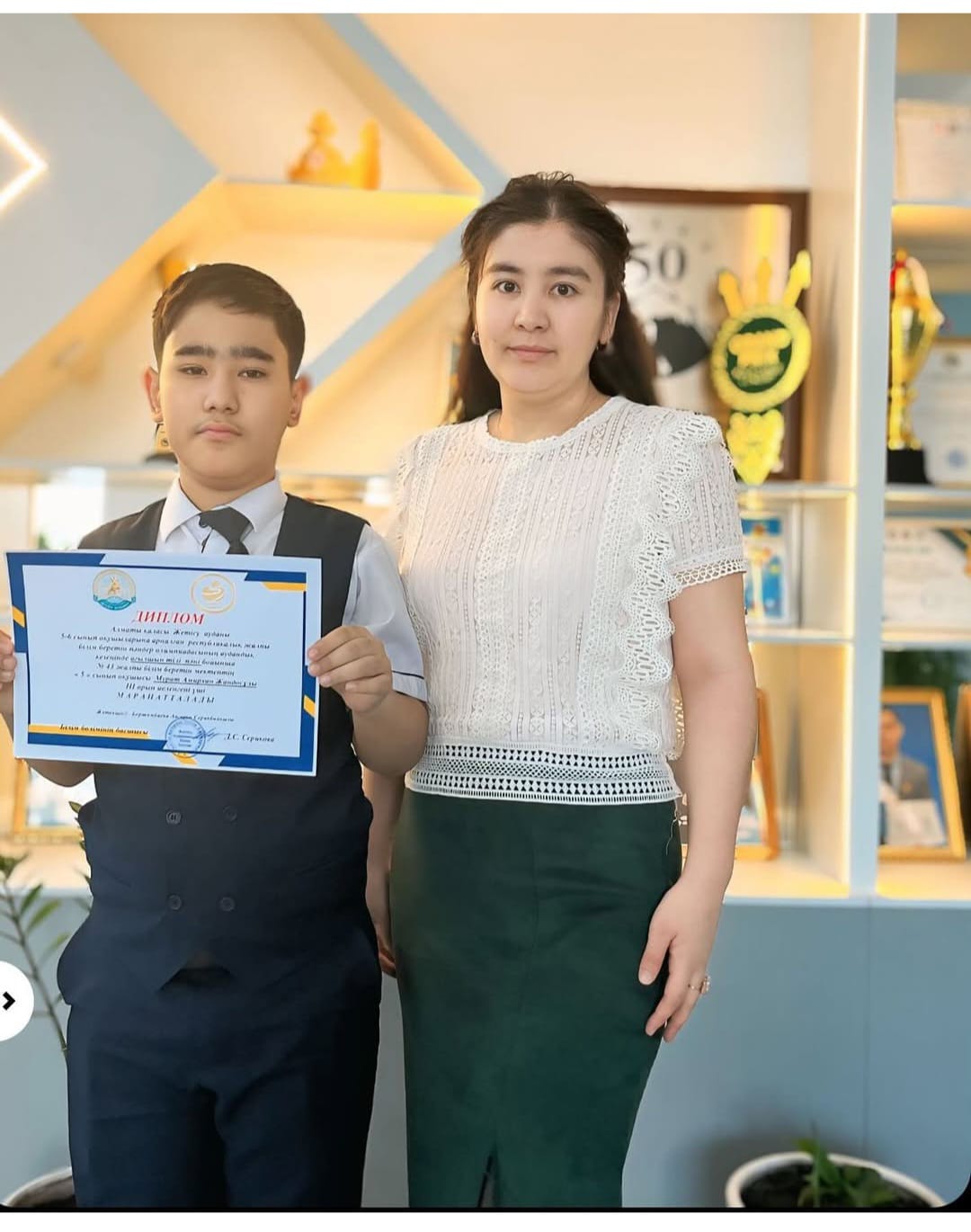 17 қаңтар 2025 0 1 2 3 4 5 Құттықтаймыз! Жалпы білім беретін пәндер бойынша 5-6 сынып оқушыларына арналған Республикалық олимпиаданың аудандық кезеңінің ағылшын тілі пәнінен 3 дәрежелі дипломмен 5 сынып оқушысы Мұрат Амирхан Жандосұлы марапатталды. Жетекшісі: Бержембаева А.С