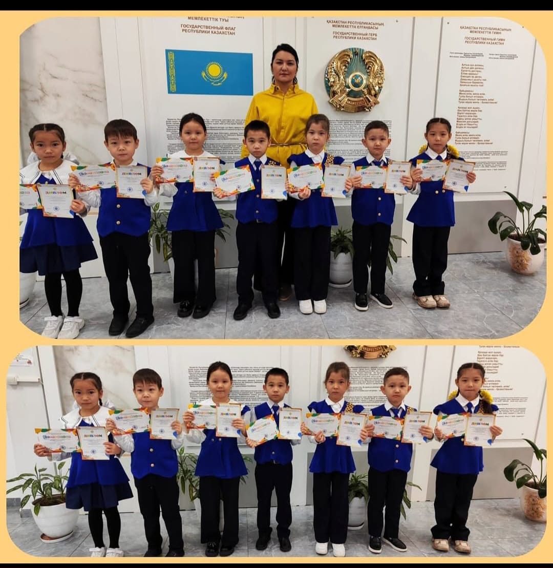 олимпиадасына қатысып, жүлделі 3 орын алған 1 «А» сынып оқушылары. Жетекшісі: Крыкбаева Назкен.